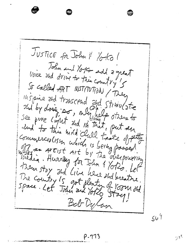 The John Lennon - Deportation ProceedingsLetters to the INS - Bob DylanDylan in 1972 had recently released "New Morning," and the single "George Jackson," a protest song about the killing of a young Black Panther in San Quentin prison. | |