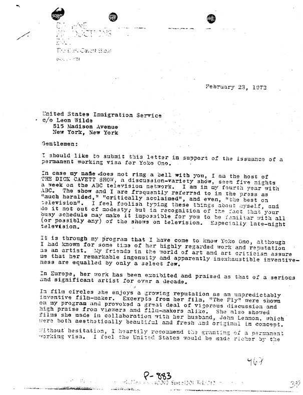 The John Lennon - Deportation ProceedingsLetters to the INS - Dick Cavett, TV host (page 1)Dick Cavett hosted a TV talk show starting in 1968. In 1972 he invited John and Yoko to perform "Woman is the Nigger of the World" on his show, and he testified in their deportation hearings. | |