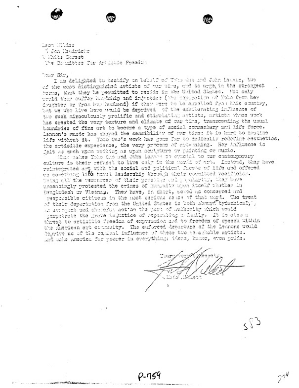 The John Lennon - Deportation ProceedingsLetters to the INS - Kate Millett - feministFeminist writer and activist Kate Millett is best known for her 1970 book Sexual Politics, which critiqued sexism in literature. She was an old friend of Yoko's in 1972. | |