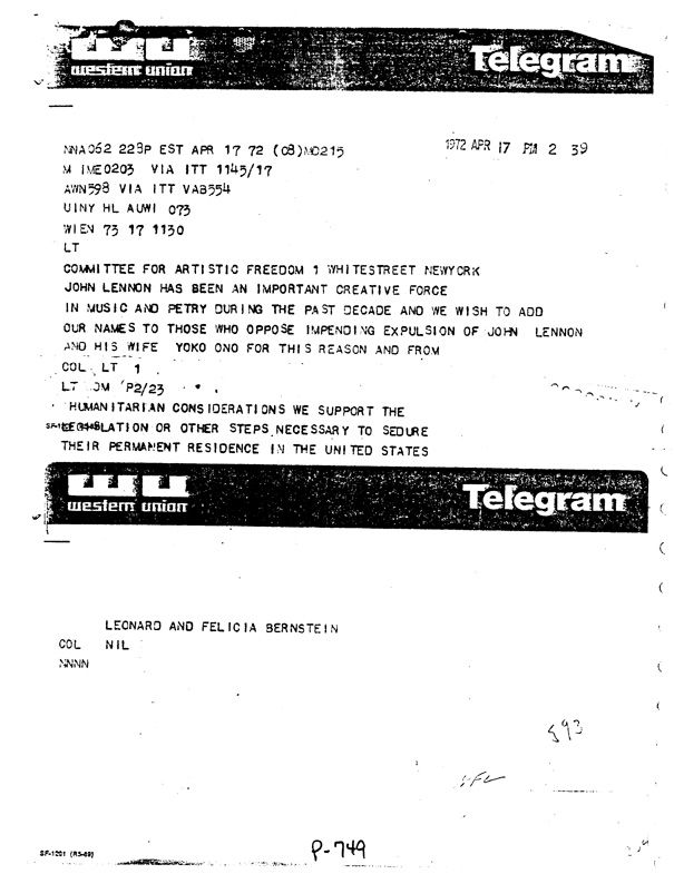 The John Lennon - Deportation ProceedingsLetters to the INS - Leonard Bernstein - composerBernstein was America's most famous composer and orchestra conductor, best known for the music in "West Side Story" on Broadway in 1957 and on film in 1961. He died in 1990. | |