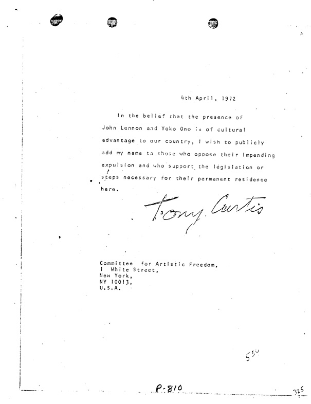 The John Lennon - Deportation ProceedingsLetters to the INS - Tony Curtis - actorTony Curtis was an immensely popular movie star of the 1950s and 1960s, whose credits include the comedy "Some Like it Hot" with Marilyn Monroe (1959) and the drama "The Defiant Ones" (1958) in which he played a racist convict chained to Sidney Poitier. By 1972 he had starred in more than 60 films. Tony Curtis died in September, 2010. | |